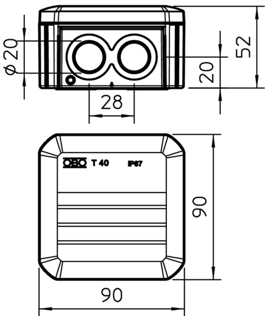 Made from thermoplastic polypropylene polymer with plug-in seals made of ethylene vinyl acetate (EVA). This allows installation of cables either directly through the 7 x ø20 seals, or the seals can be cut with a knife at the pre-marked points, in order to create an insertion opening for cables or pipes. Alternatively, cable glands can be pushed through the openings instead of the seals and locked with a locknut from the inside. The junction boxes can be mounted on mounting plates in the openings on the floor using steel screws 3.5 x 9.5. Clear internal dimensions: 77 x 77 x 46 mm Cover with labelling panel and lead-sealed.